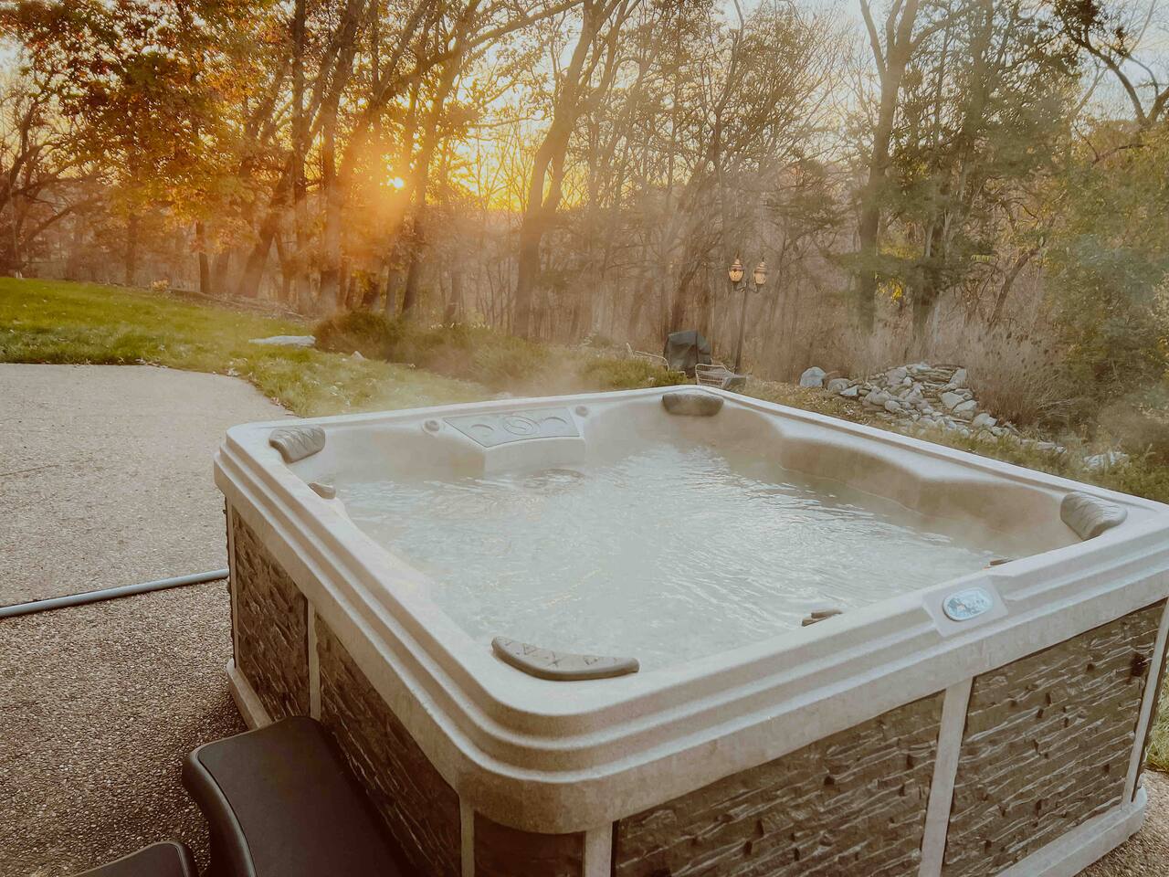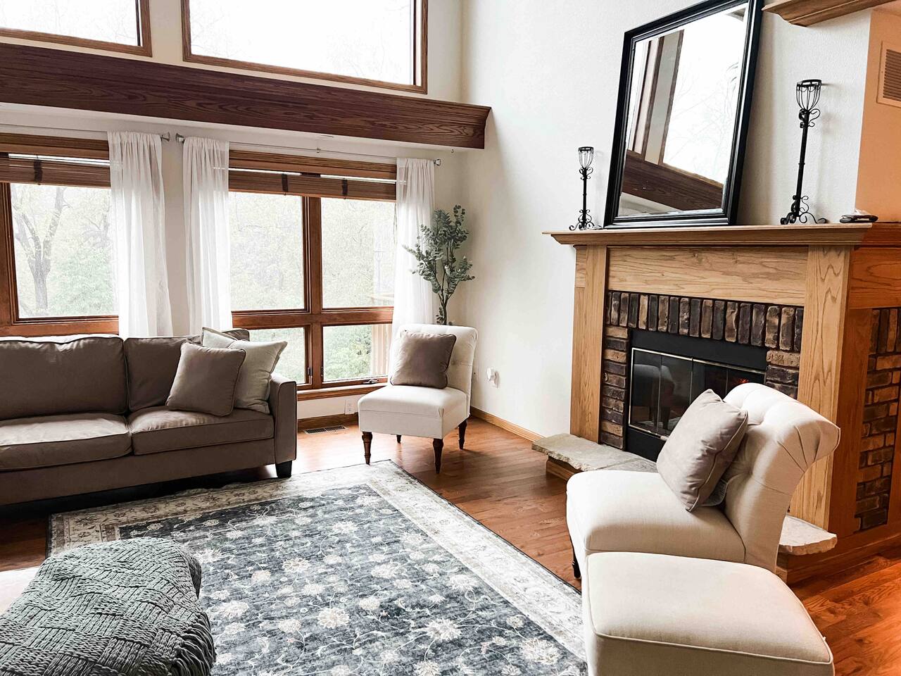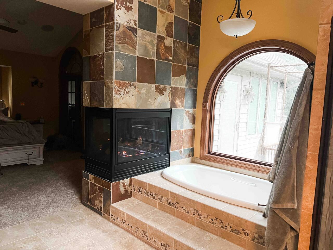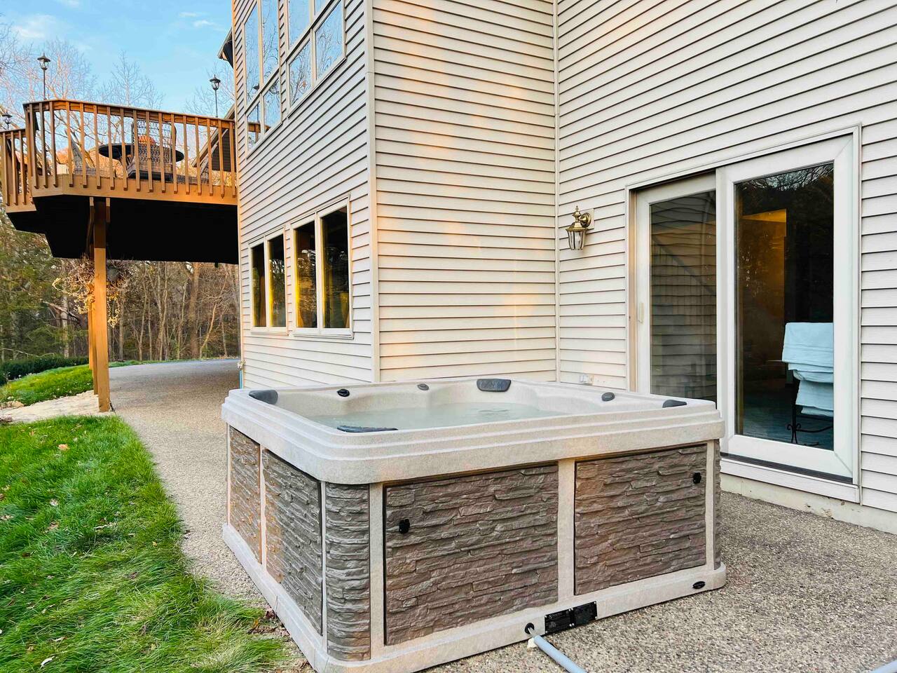 Beautiful bricked home is on 3 acres in the back of a quiet, wooded neighborhood. Our home has a king bed in a large master suite that includes a soaker tub, large shower, private gas fireplace, and heated bathroom floors. The suite also boasts a private outdoor deck with its own gas fire pit. The home also two kitchens and four separate den/family room areas. Additional amenities include a 7 person hot tub, pool table and dart board game room, and several large outdoor patios.